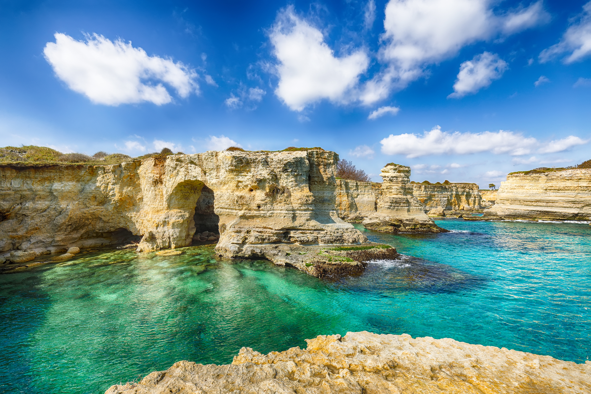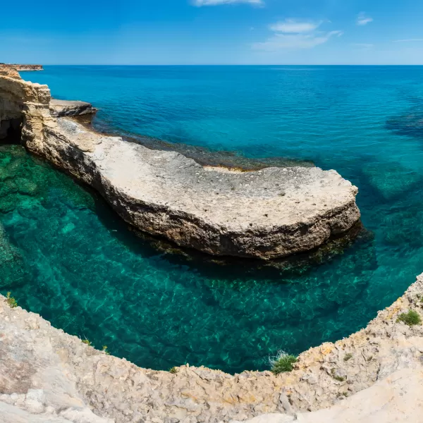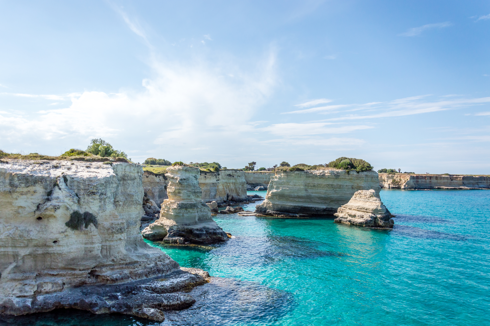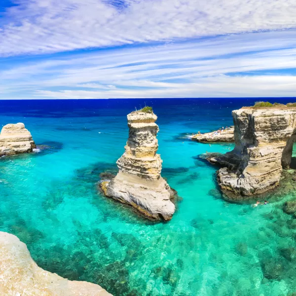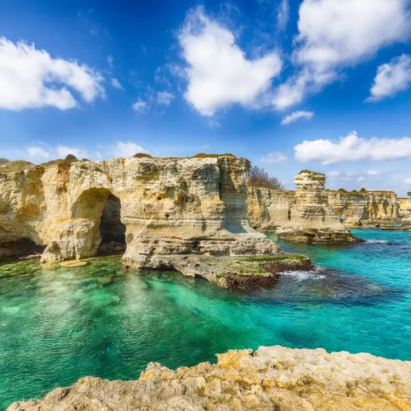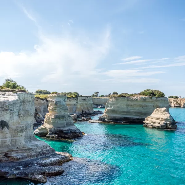 La costa adriatica è prevalentemente rocciosa, caratterizzata spesso da falesie e faraglioni. Il tratto costiero a Sud di Lecce fino a Santa Maria di Leuca è inoltre noto per la presenza di numerose splendide grotte carsiche, raggiungibili via mare e/o via terra.