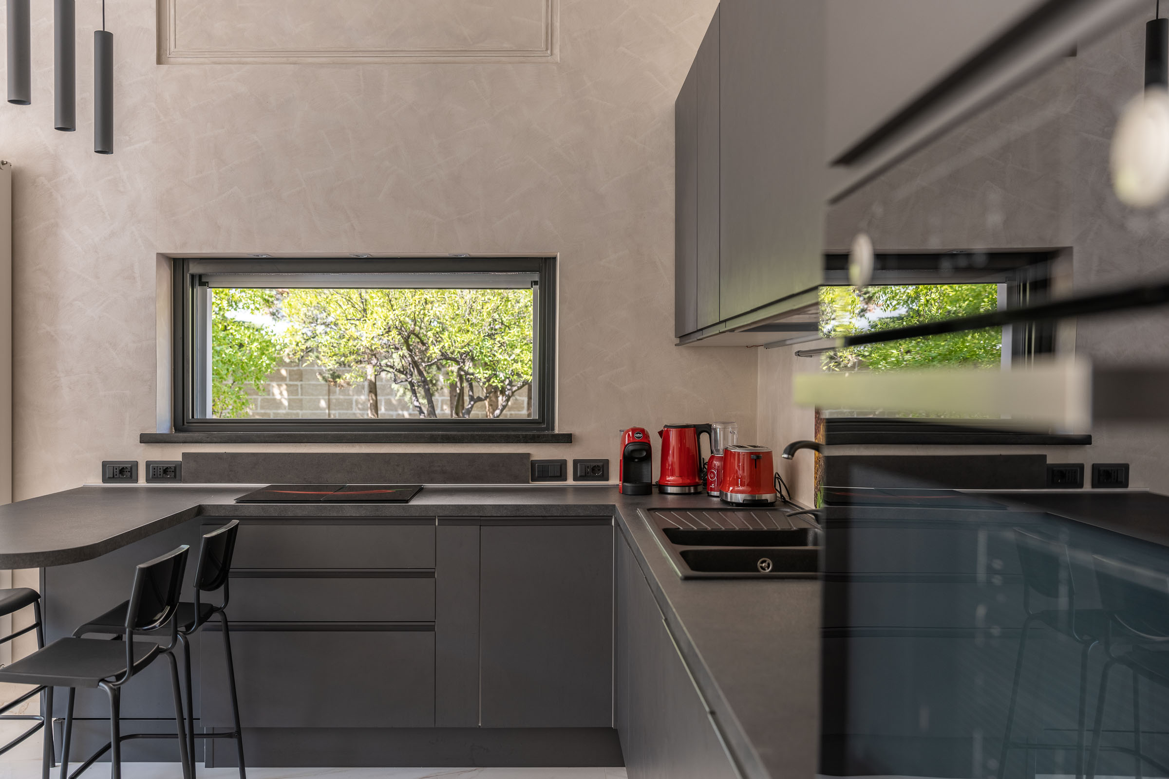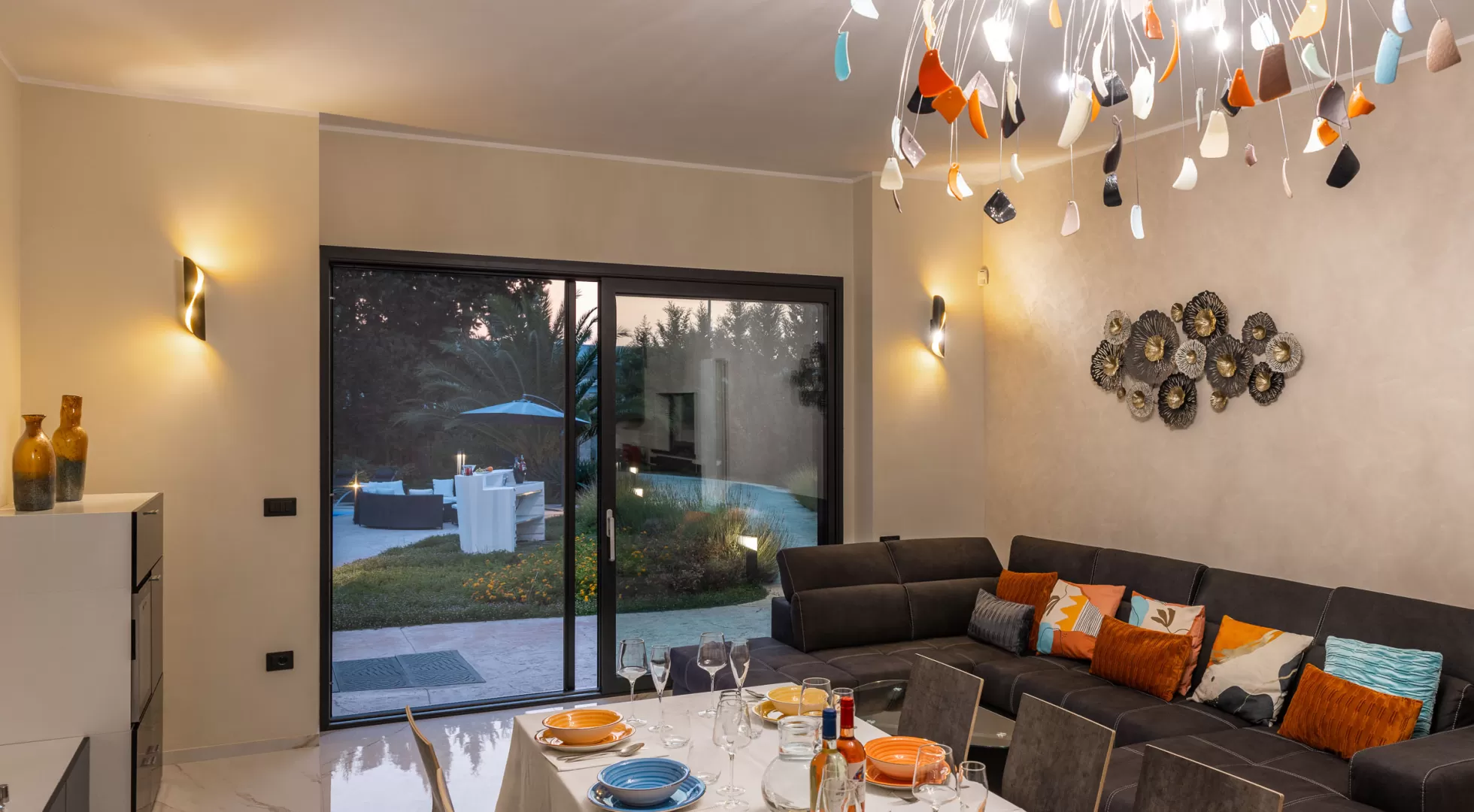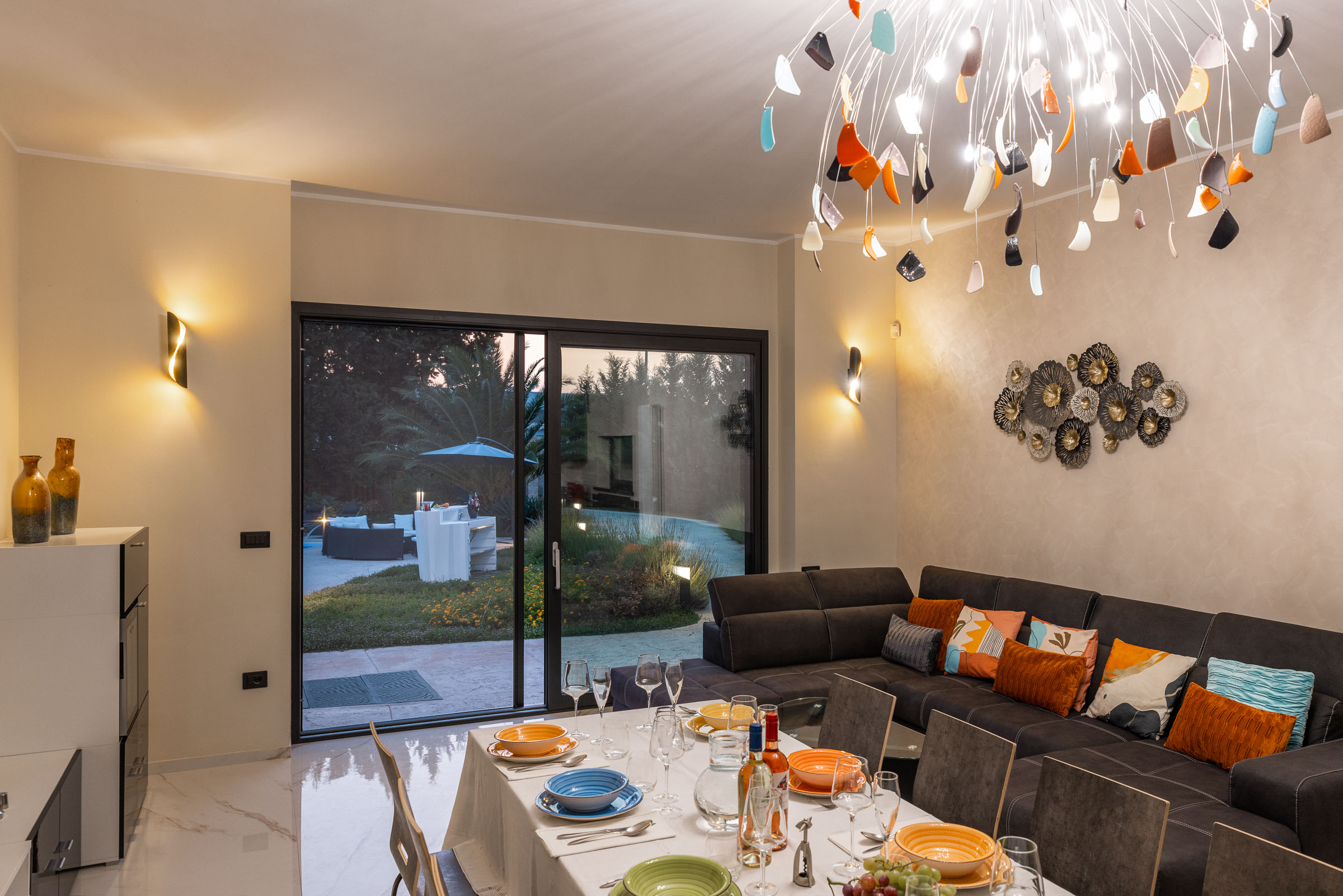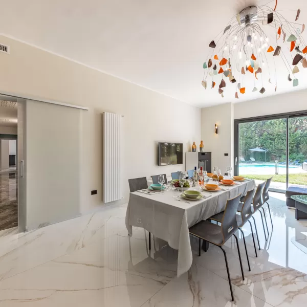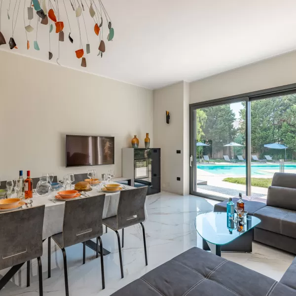 L'ampio soggiorno è connotato da vetrate a tutta parete, con vista piscina e giardino ed è dotato di una