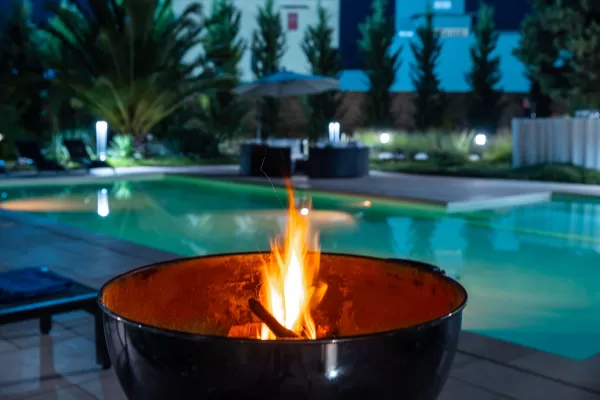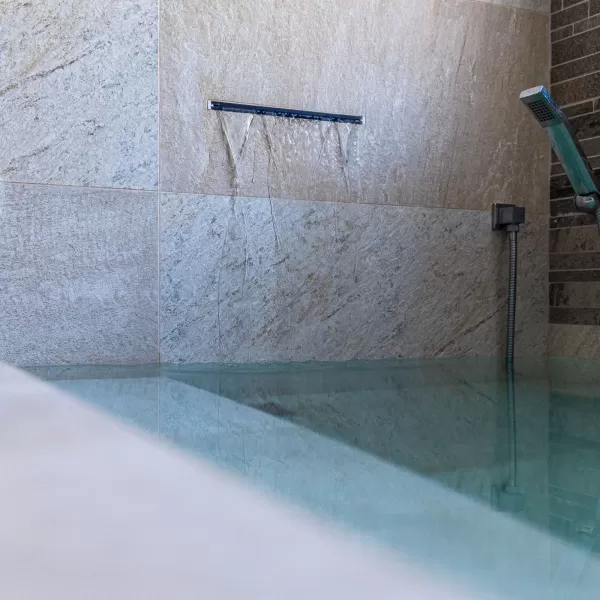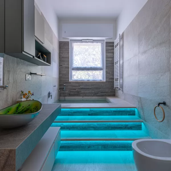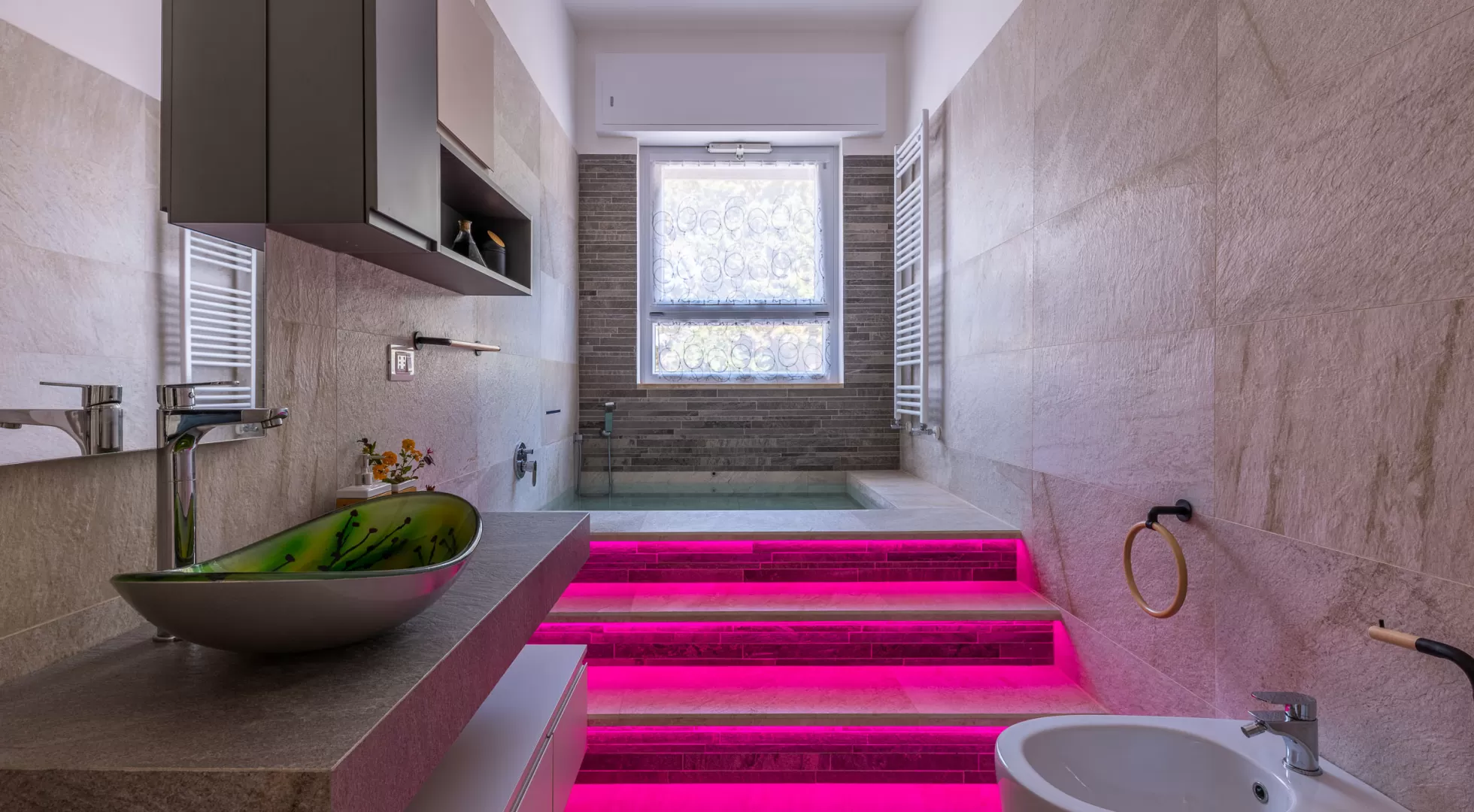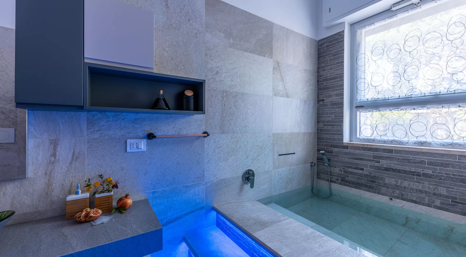 L'ampio soggiorno è connotato da vetrate a tutta parete, con vista piscina e giardino ed è dotato di una