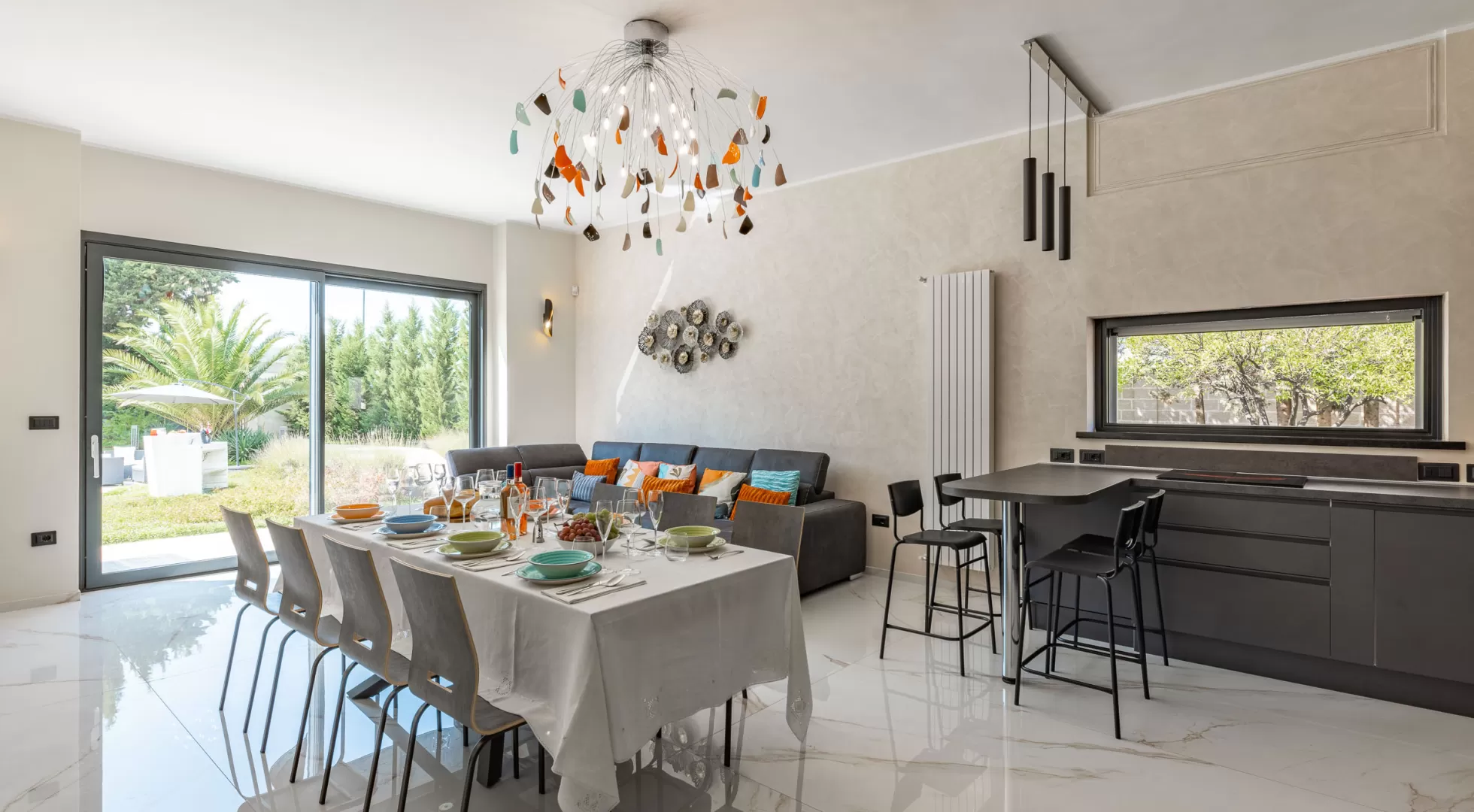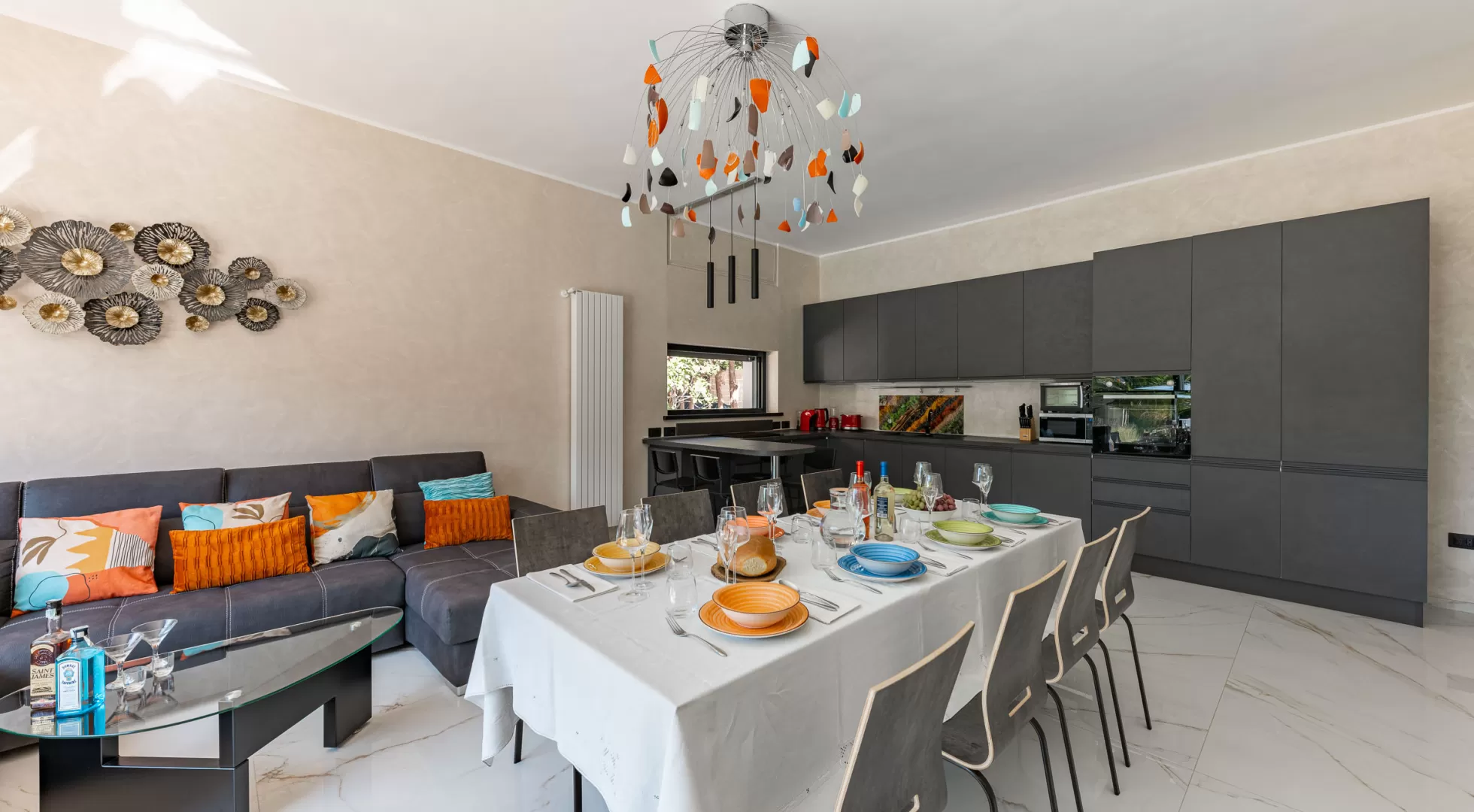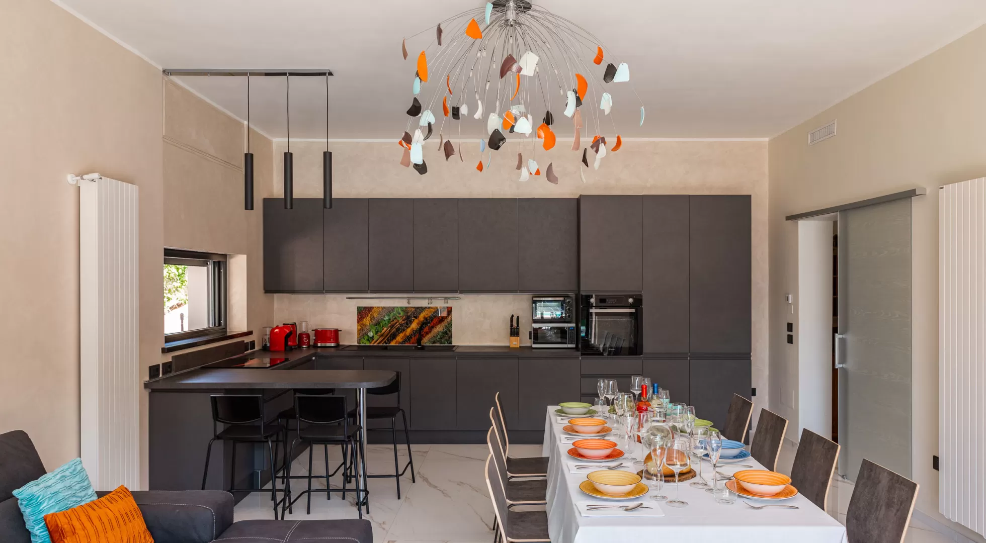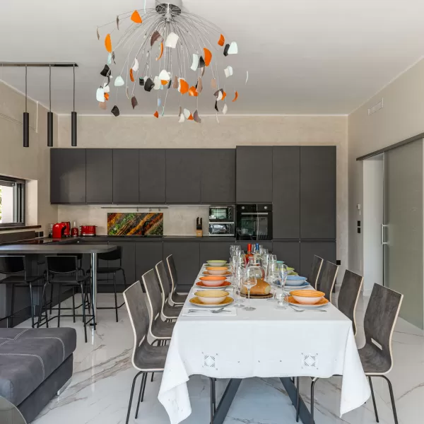 nuovissima cucina moderna super accessoriata, tavolo da pranzo e un grande divano con